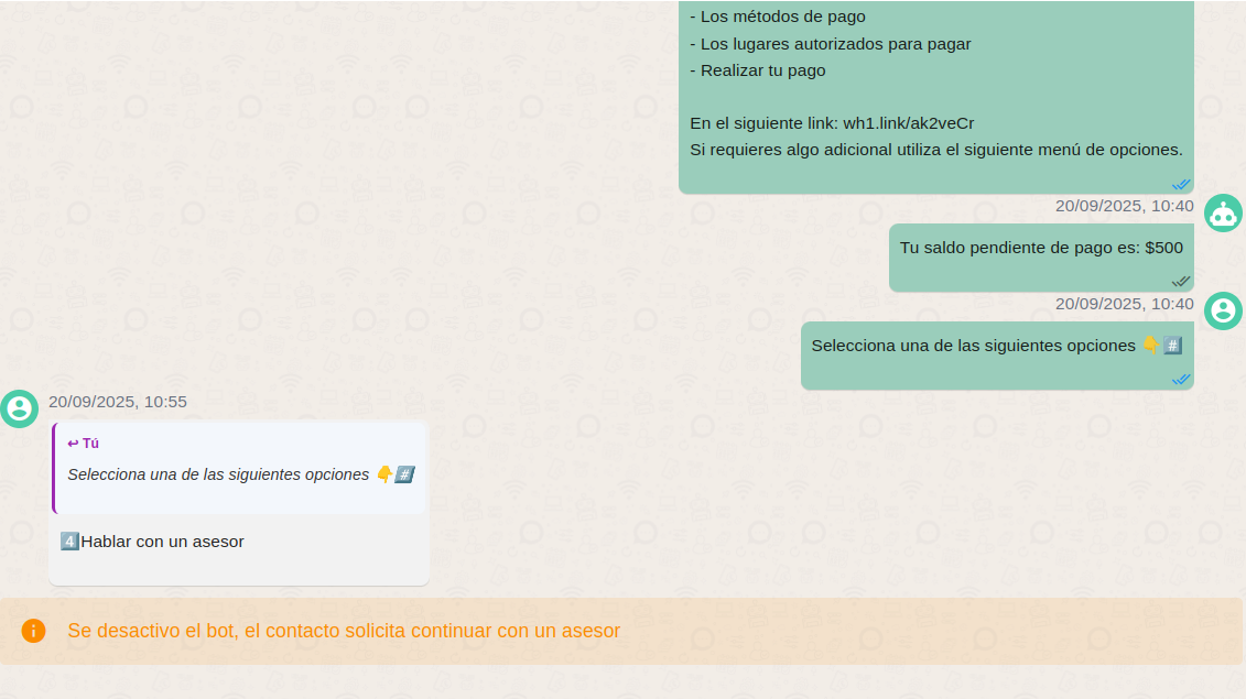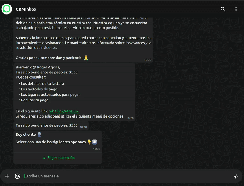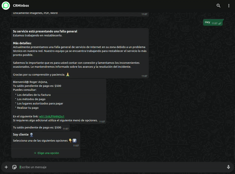 El bot proporcionará de inmediato la información necesaria, incluyendo detalles de tu factura, los métodos y lugares de pago autorizados, y un enlace directo para gestionar tu pago de forma rápida y sencilla.