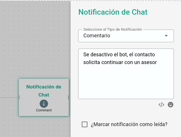 Esta es una opción se encuentra dentro del flujo. Su función es asignar a un equipo dentro de CRMInbox y mandar una notifiación dentro del chat. Asimismo sucede algo similar al seleccionar "Quiero contratar" en el Menú principal, con la diferencia que el equipo al que se asignará es el de Ventas.