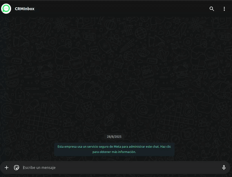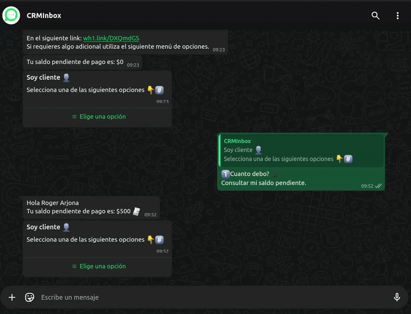 Inicia la conversación con el bot CRMInbox (envía un mensaje o selecciona "Soy cliente" → "Elige una opción").