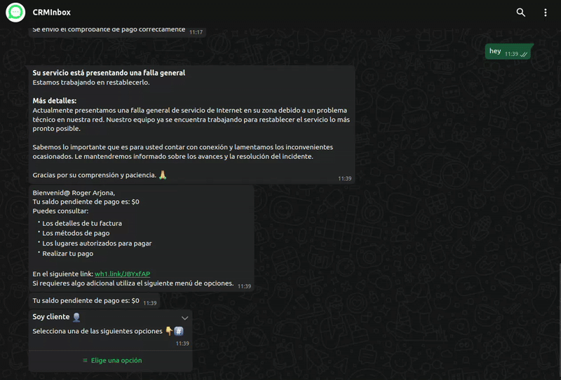 1. Cuando el bot de CRMInbox te presente las opciones bajo "Soy cliente", haz clic en el botón "Elige una opción".