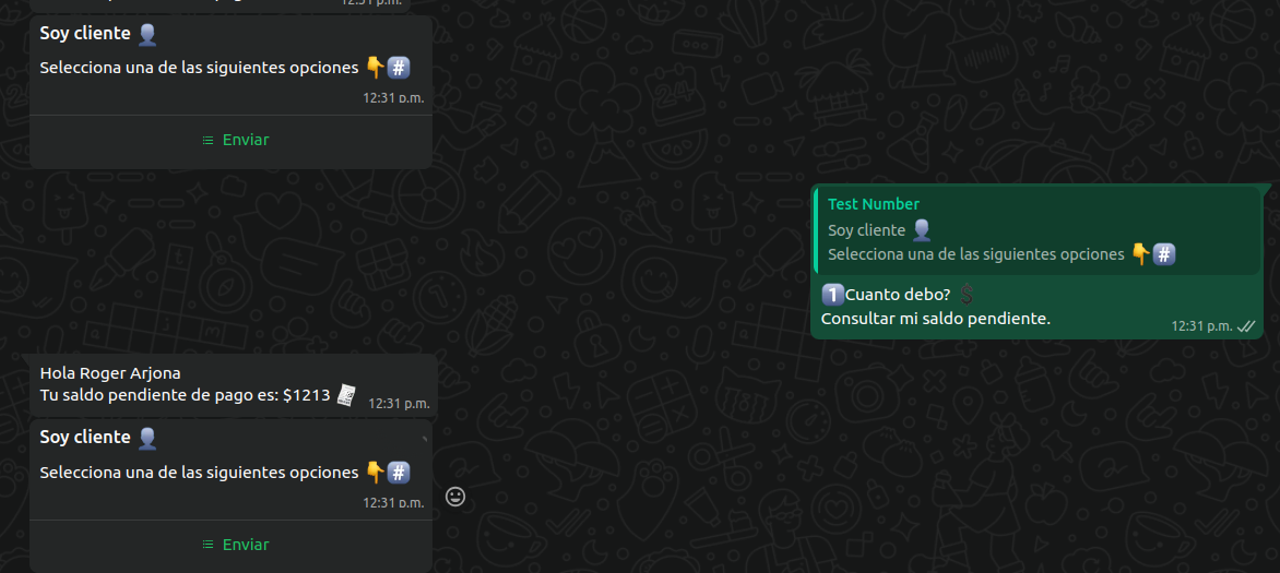 Este apartado le devuelve al usuario un mensaje con el saldo pendiente pendiente del cliente.