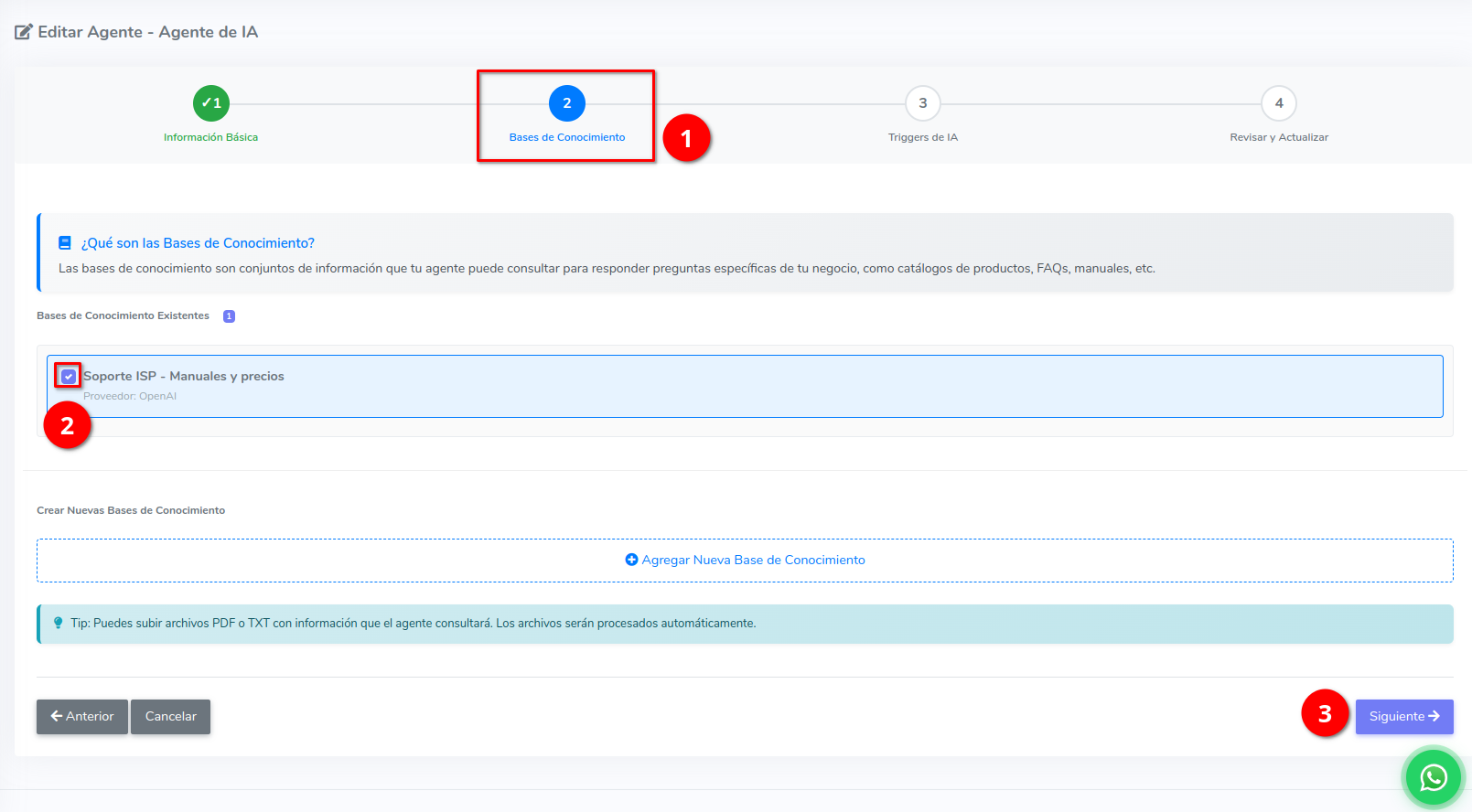 Configurar una base de conocimiento es sencillo: solo necesitas subir información útil en formato PDF o TXT de tu empresa, y tu agente de IA podrá utilizarla para responder con mayor precisión y contexto a las consultas de tus clientes.