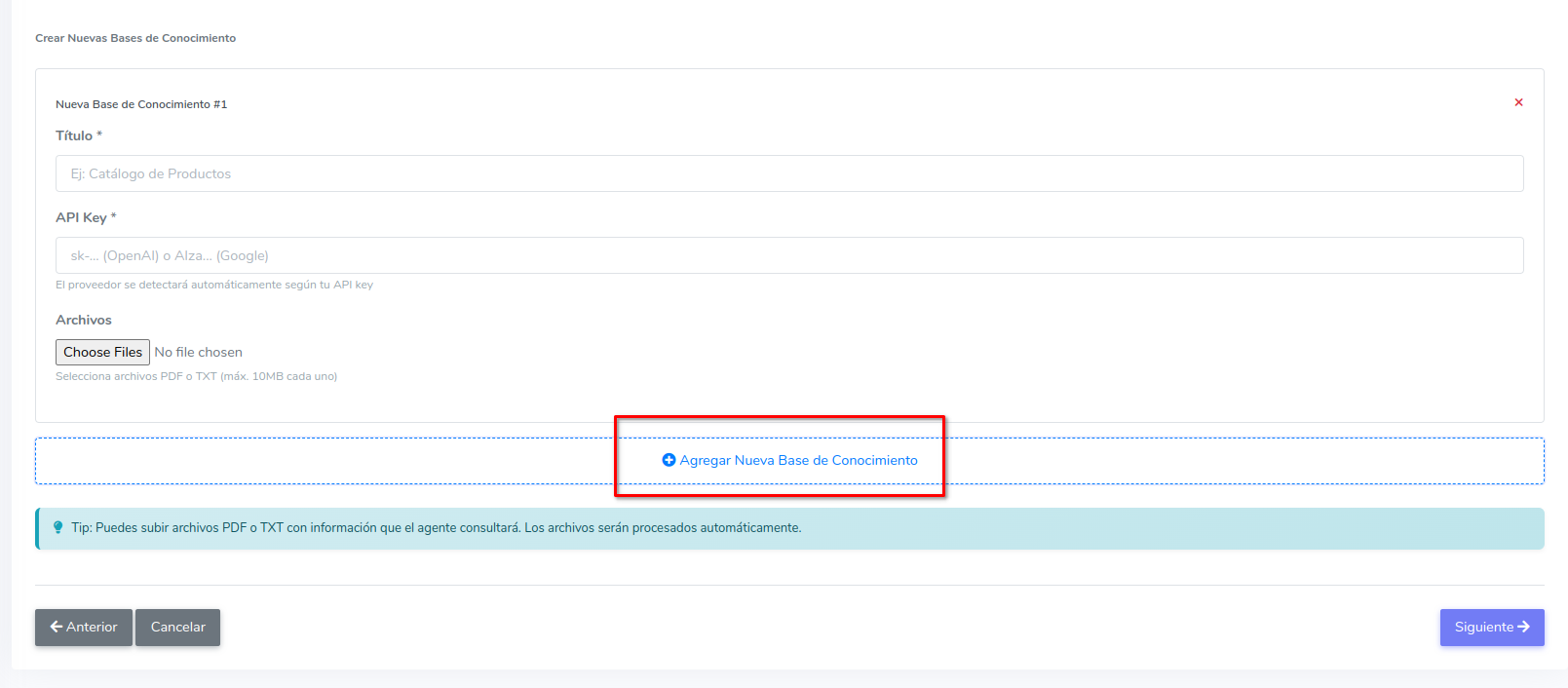 Puedes crear una base de conocimiento dentro del mismo formulario del agente. Presiona el botón que dice Agregar base de conocimiento.