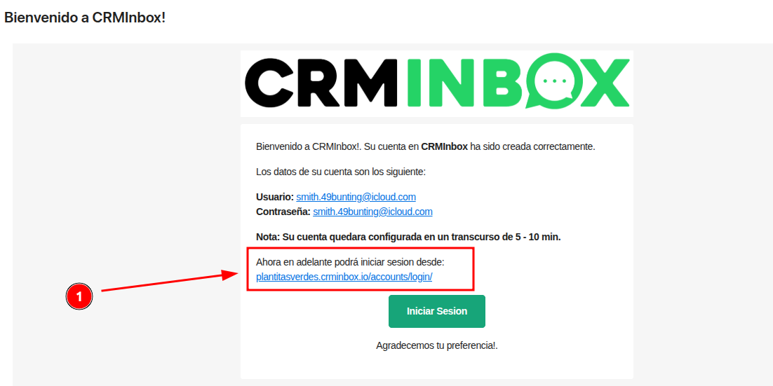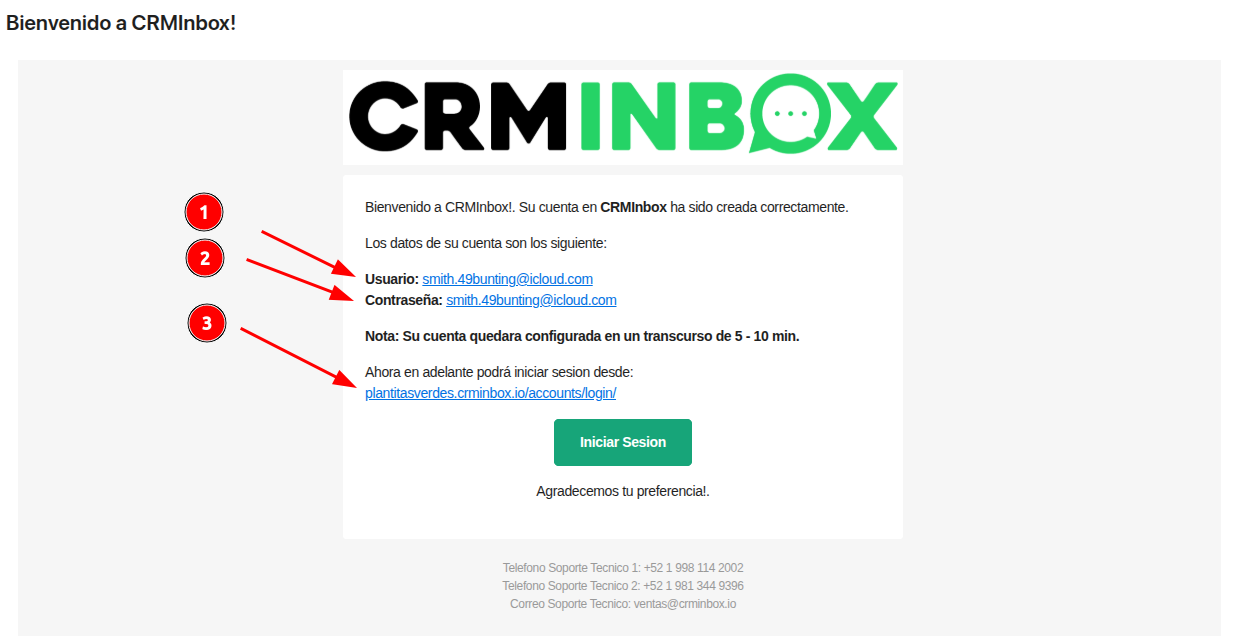Revisa tu bandeja de entrada (incluyendo la carpeta de spam) para encontrar el correo electrónico enviado por CRMInbox al momento de crear tu cuenta. Este correo contiene: