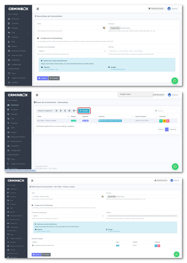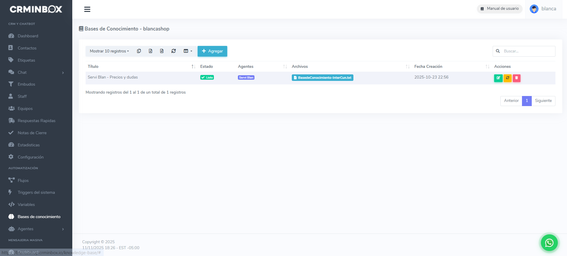 Este proceso permite que la IA del chatbot conozca y responda correctamente sobre tus planes, precios, servicios o políticas.