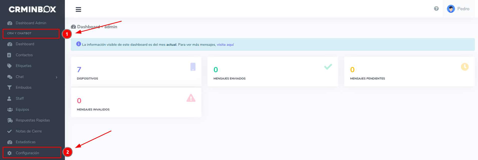 1 Dirigirse al módulo CRM y ChatBot, luego seleccionar "Configuración".