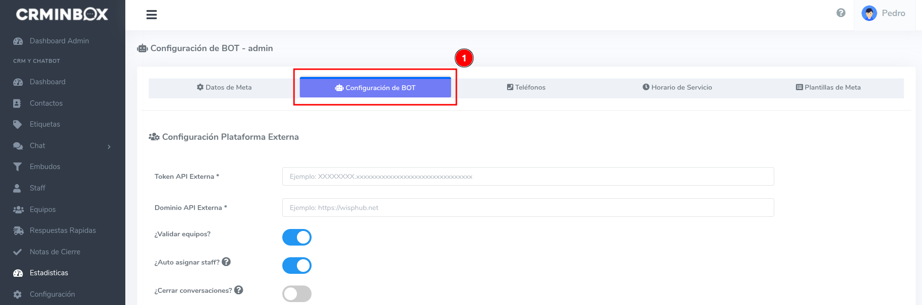 Desde el menú principal, localiza la sección "CRM y ChatBot" y haz clic en la opción "Configuración". Este será tu punto de entrada para acceder a todas las configuraciones relacionadas con el bot y las integraciones externas.
