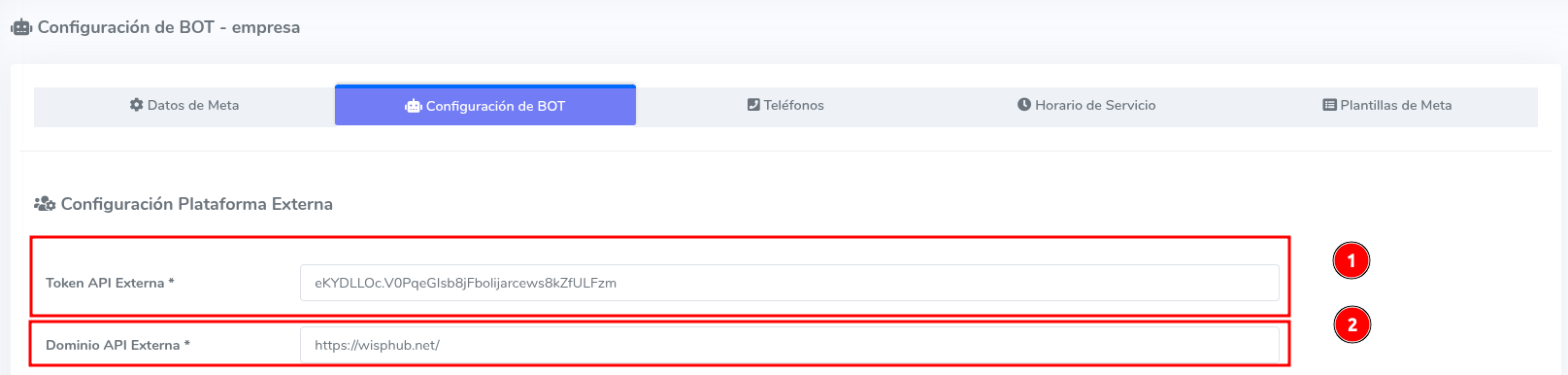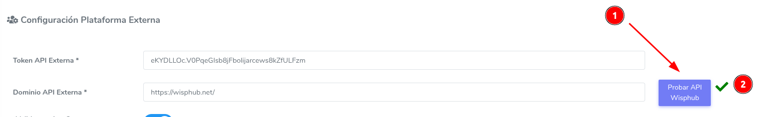 1.- En el campo "Token API Externa", introduce la clave proporcionada por el personal de Wisphub.