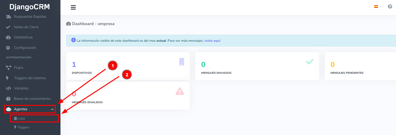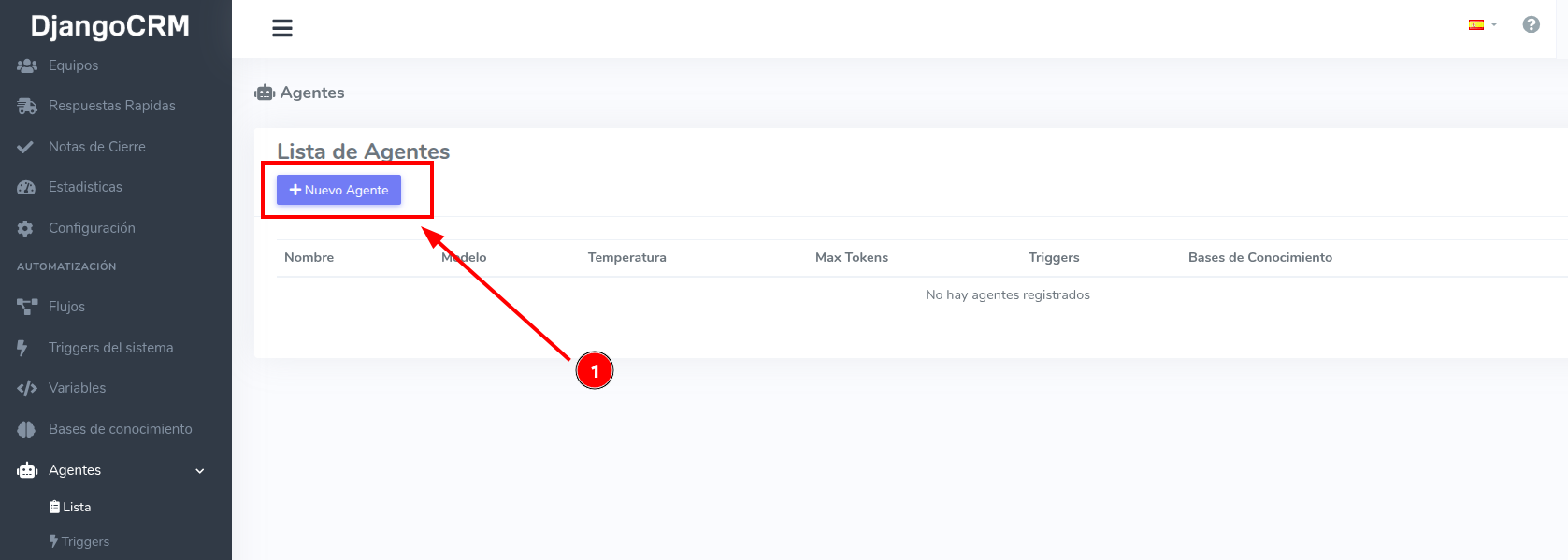 Una vez dentro del módulo de Agentes, localiza y haz clic en el botón "Nuevo Agente" para comenzar el proceso de configuración.