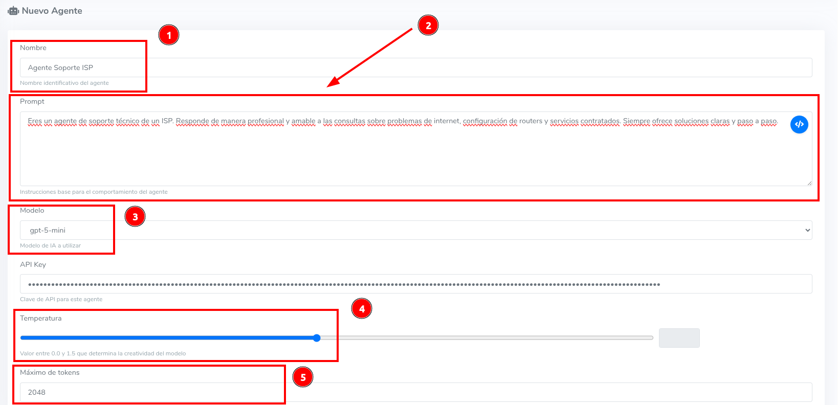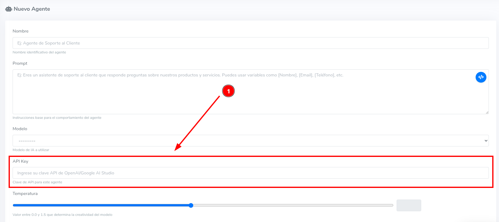 IMPORTANTE: Antes de completar el formulario, necesitas obtener una llave de agente de IA (API Key) proporcionada por proveedores como OpenAI, Google Studio u otros servicios similares. Una vez obtenida, ingresalo en el campo marcado.