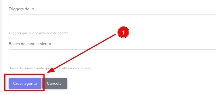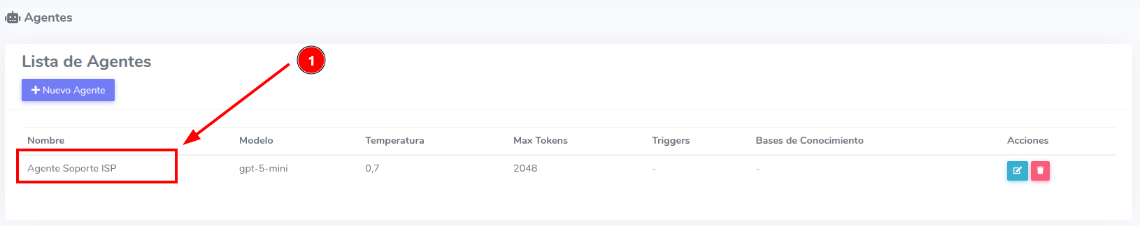 Una vez completado el formulario correctamente, haz clic en "Crear agente". El agente será creado y podrás visualizarlo en la lista de agentes disponibles. Desde aquí podrás editarlo o eliminarlo utilizando los íconos correspondientes.
