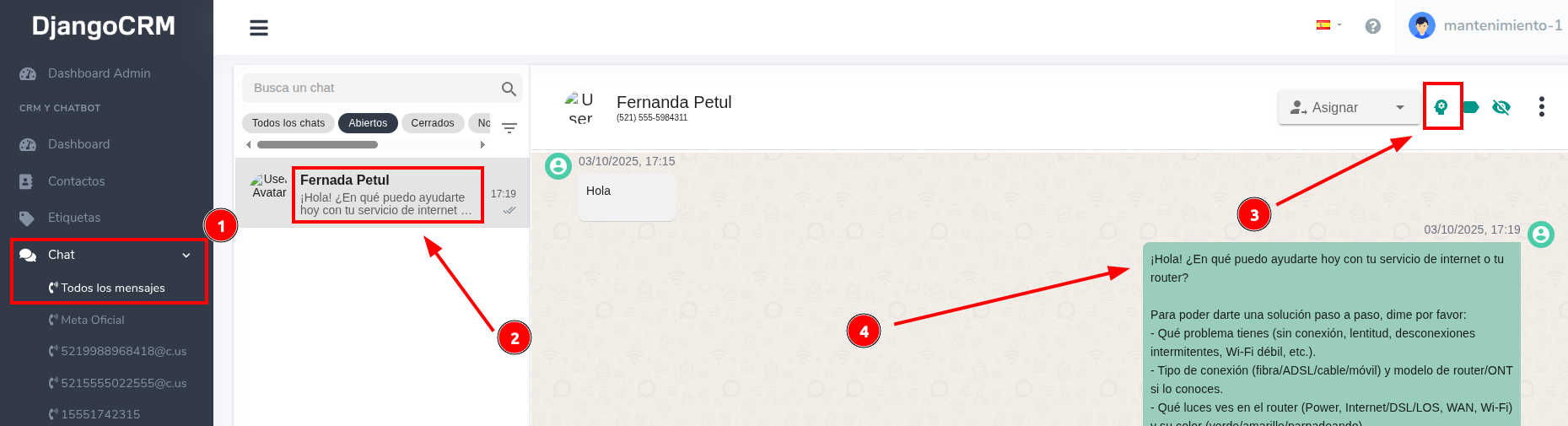 3.- Haz clic en el ícono de "Agente" para activarlo en esa conversación.
