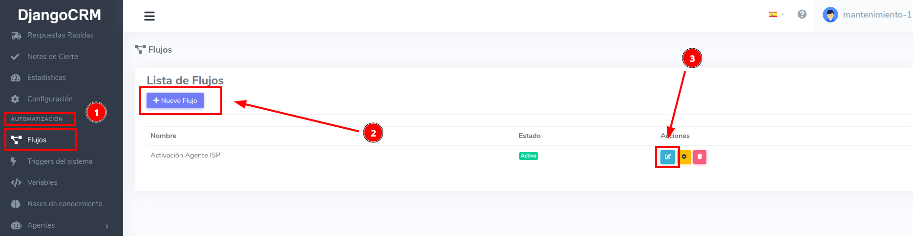 2.- Haz clic en "Nuevo Flujo". Asigna un nombre descriptivo al flujo (ejemplo: "Activación Agente ISP").
