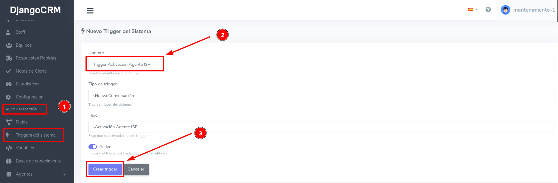 Ahora configura un System Trigger para que el agente se active automáticamente:
