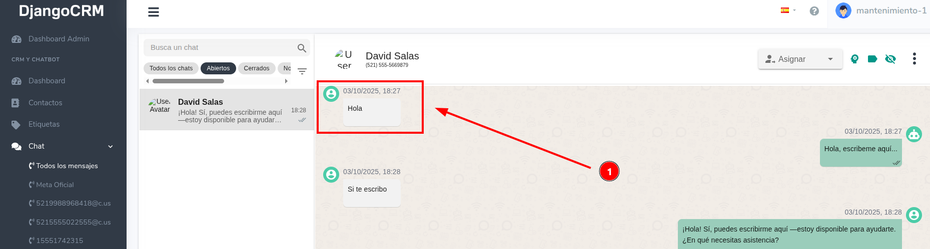 1.- Abre el Chat y Envia un mensaje al número registrado de CRMInbox (Es posible que debas cerrar tu conversación)