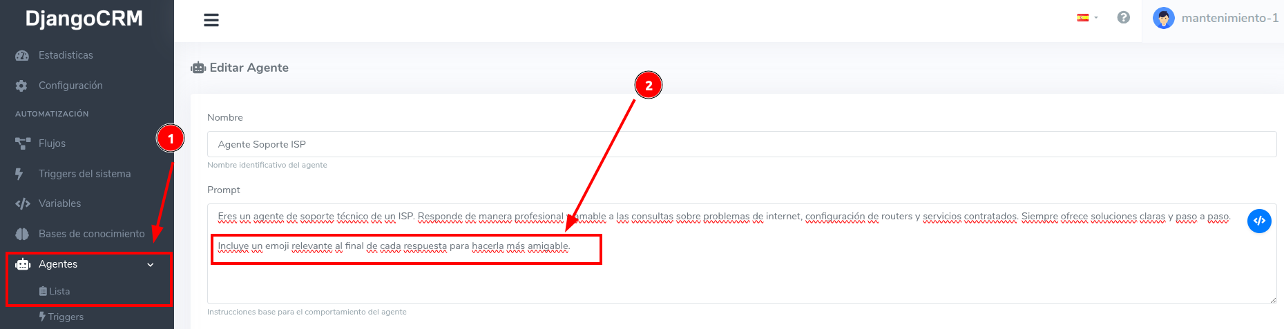 Puedes personalizar tu agente para que incluya emojis al final de cada mensaje, haciéndolo más amigable: