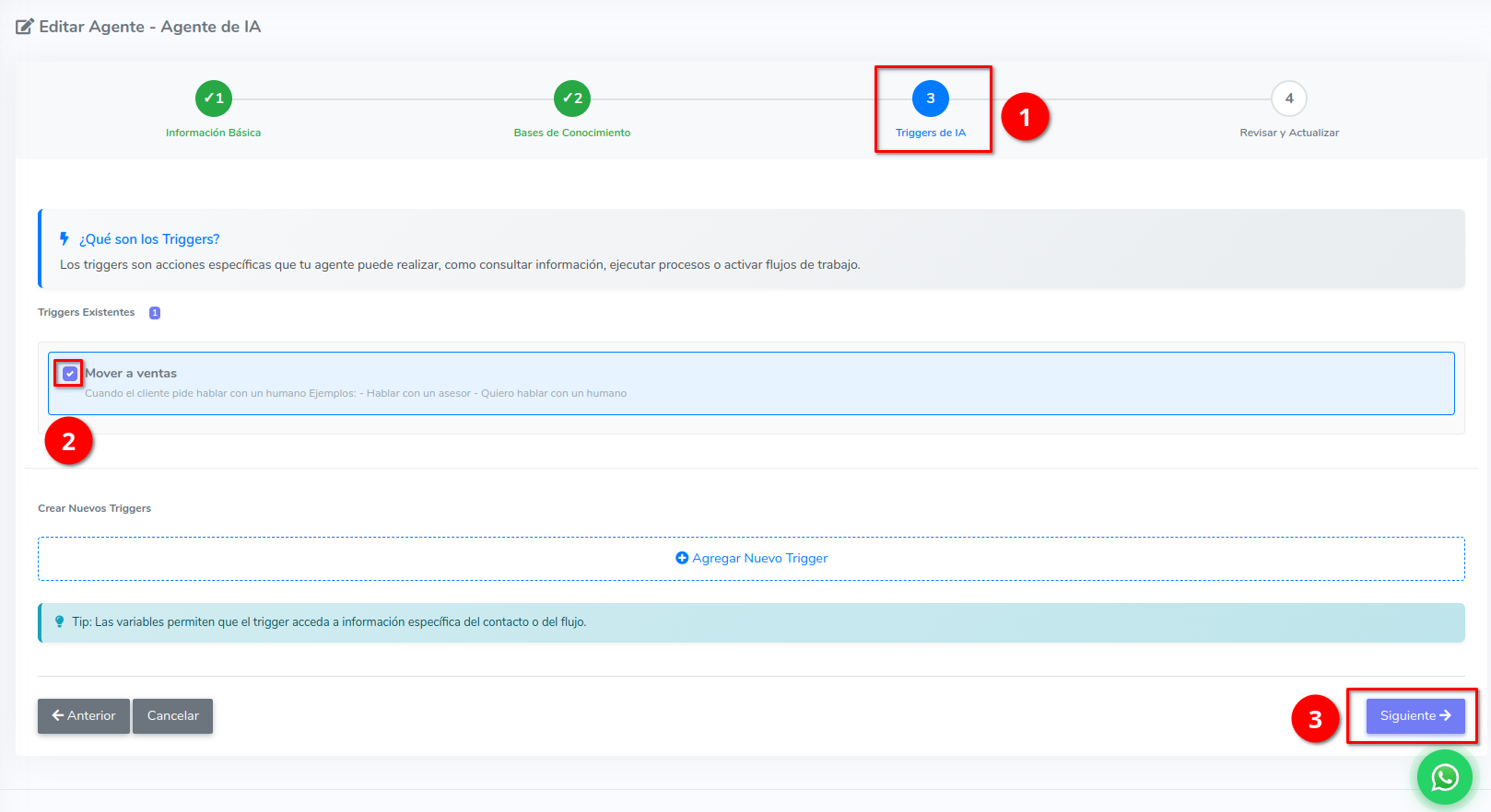 Puede crear un nuevo AI Trigger dentro del mismo formulario haciendo click en Agregar nuevo Trigger. Puede seguir los mismo pasos mencionados anteriormente, una vez hecho solo hace falta dar en Siguiente.