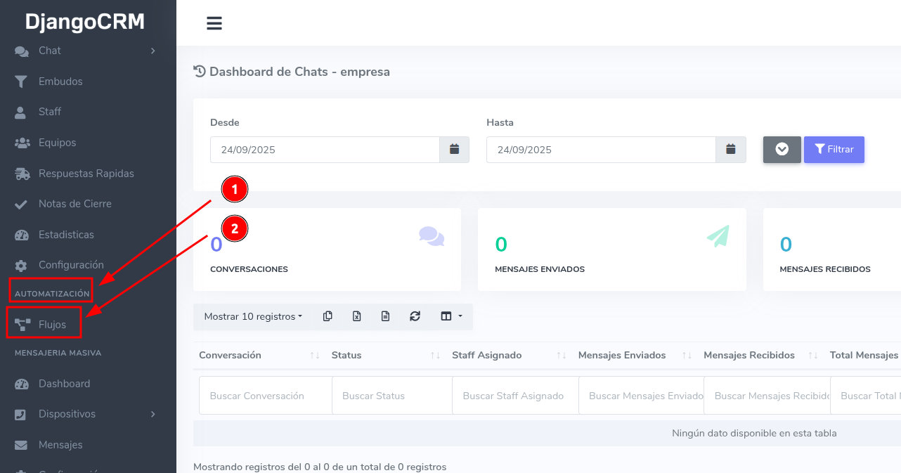 Desde el menú principal de CRMInbox, busca y haz clic en la sección "Automatización", luego selecciona "Flujos". Aquí es donde nacerá tu bot y donde podrás gestionar todos los flujos que crees para automatizar las conversaciones con tus clientes.