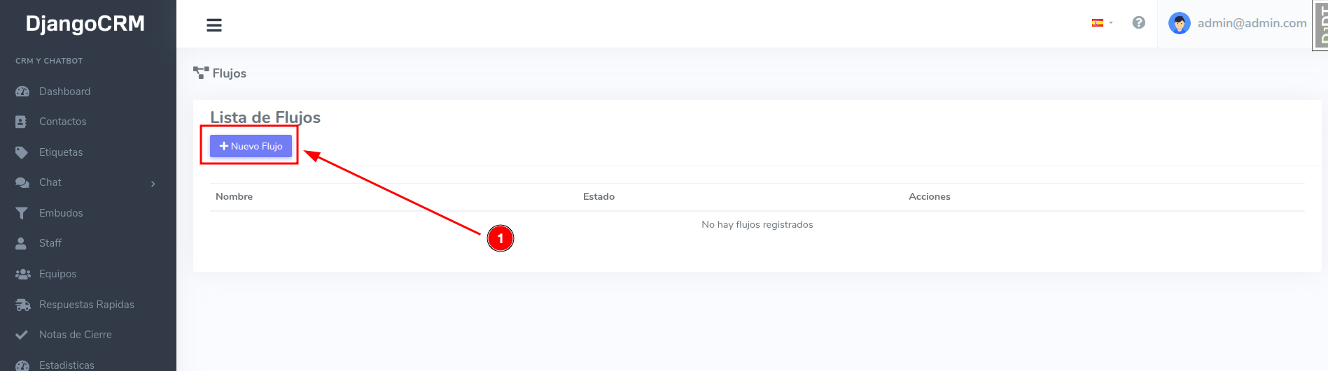 Una vez dentro del módulo de Flujos, localiza y haz clic en el botón "Nuevo Flujo". Este será el primer paso para construir la lógica de tu bot personalizado.
