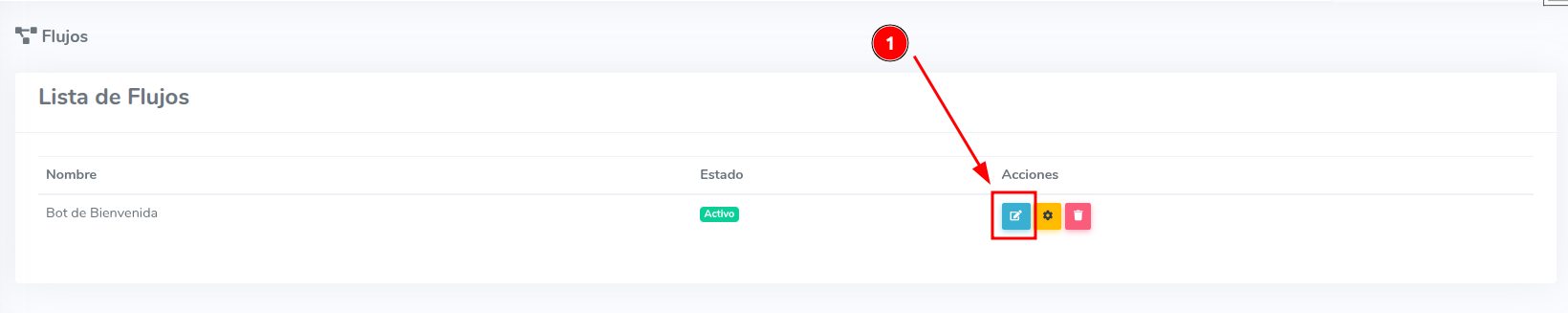 Después de crear el flujo, aparecerá en tu panel de flujos. Para comenzar a construir la lógica de tu bot, necesitas editarlo. Busca el ícono de "Editar" (generalmente representado por un lápiz) y haz clic en él. ¡Prepárate para ver la magia de nuestro lienzo!