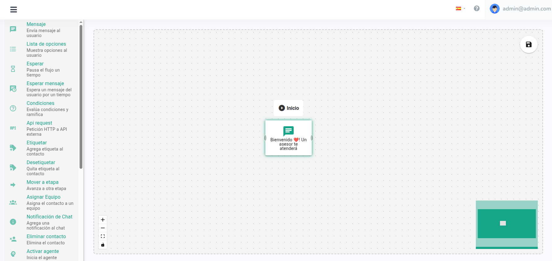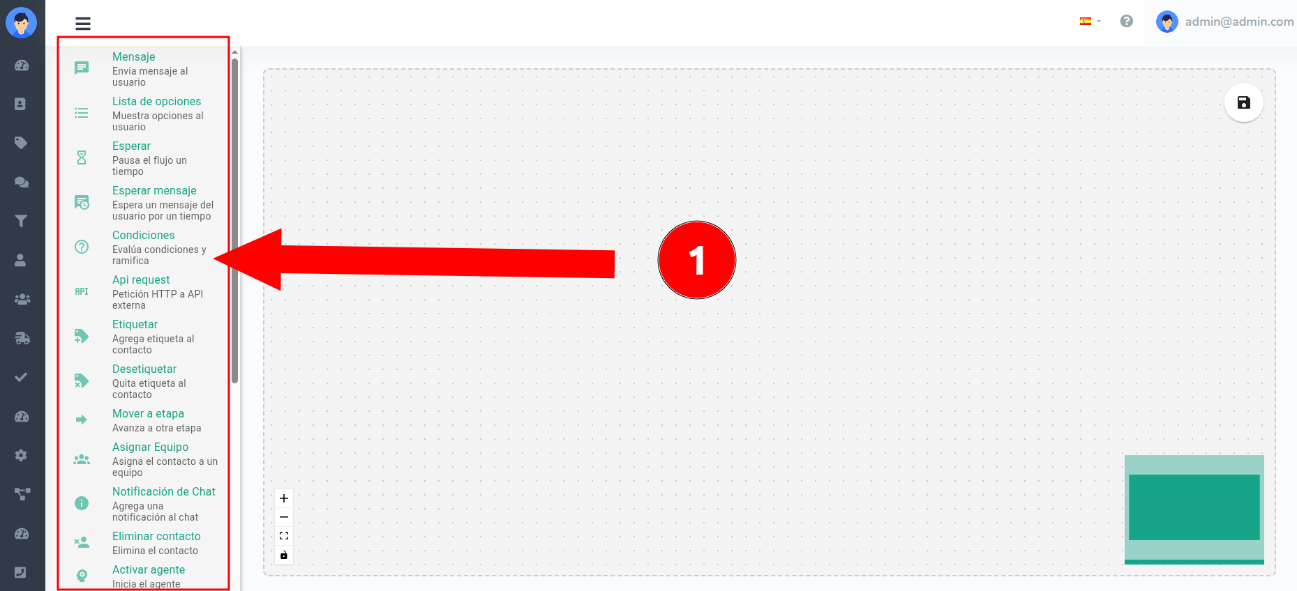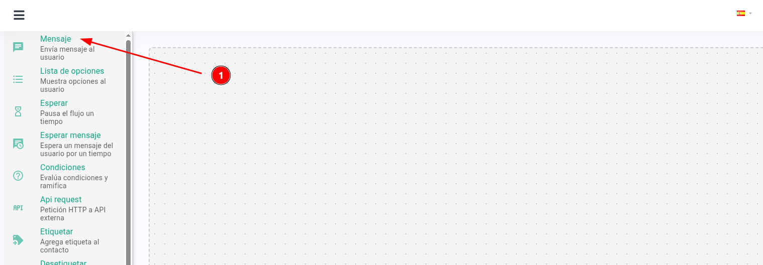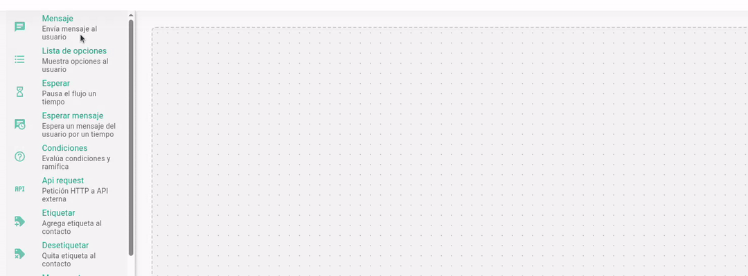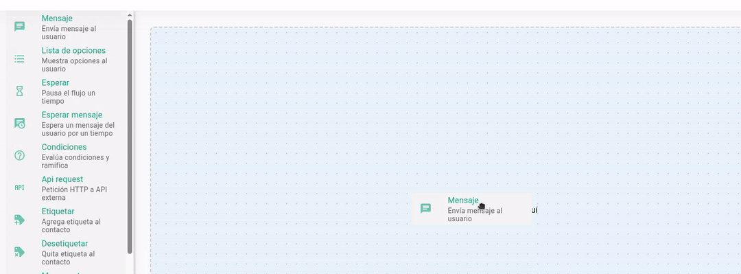 ¡Bienvenido al lienzo (Canvas)! 🎨 Aquí es donde construirás visualmente tus bots y/o automatizaciones. En la sección izquierda encontrarás la biblioteca de acciones disponibles que tu bot puede ejecutar. Cada bloque representa una funcionalidad diferente. Para este tutorial, nos enfocaremos en el bloque de "Mensaje", pero puedes consultar información detallada de cada bloque en: [En Nuestro Manual]