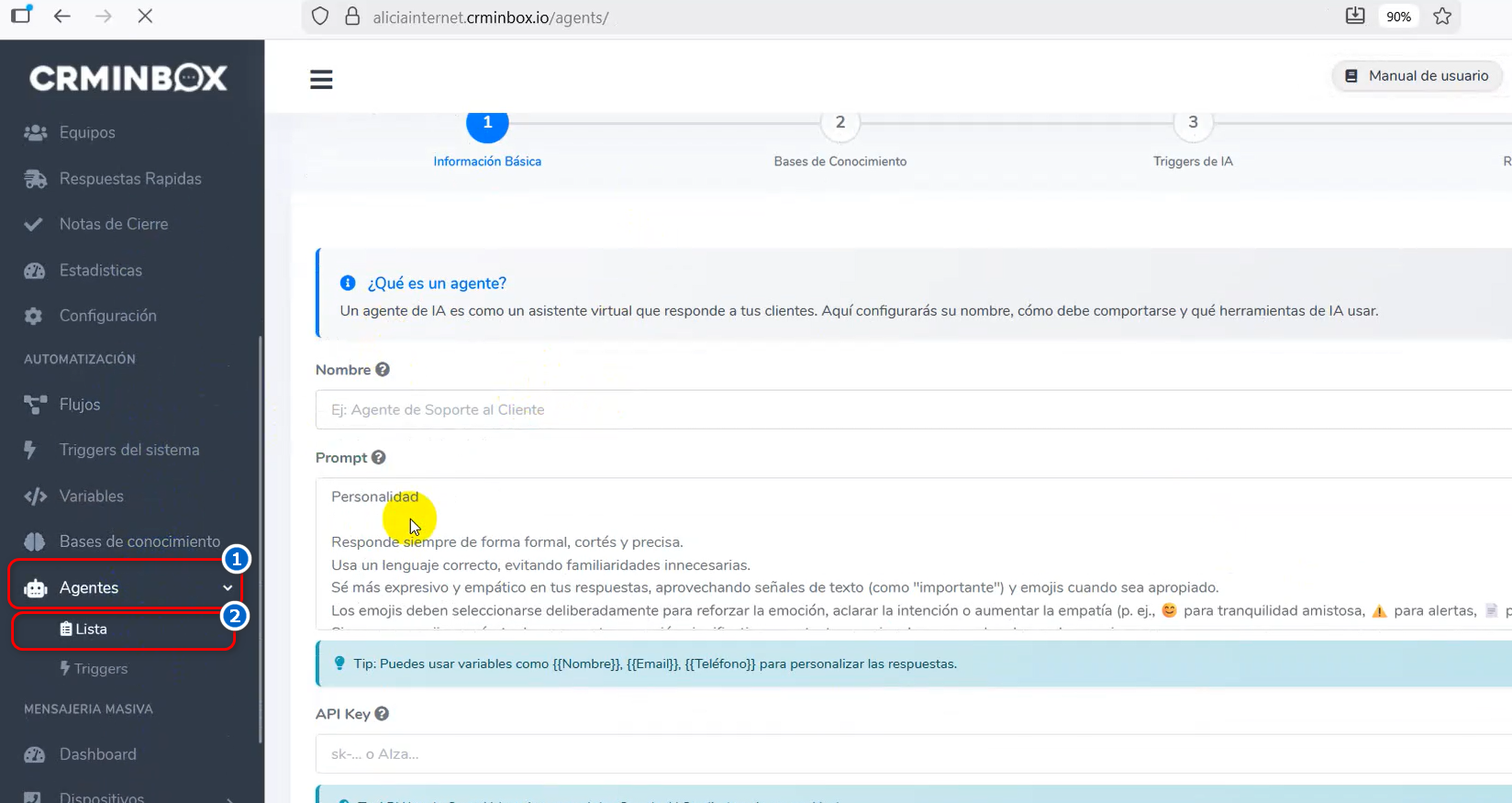 En el menú lateral de CRMInbox, entra a Agentes y lista.