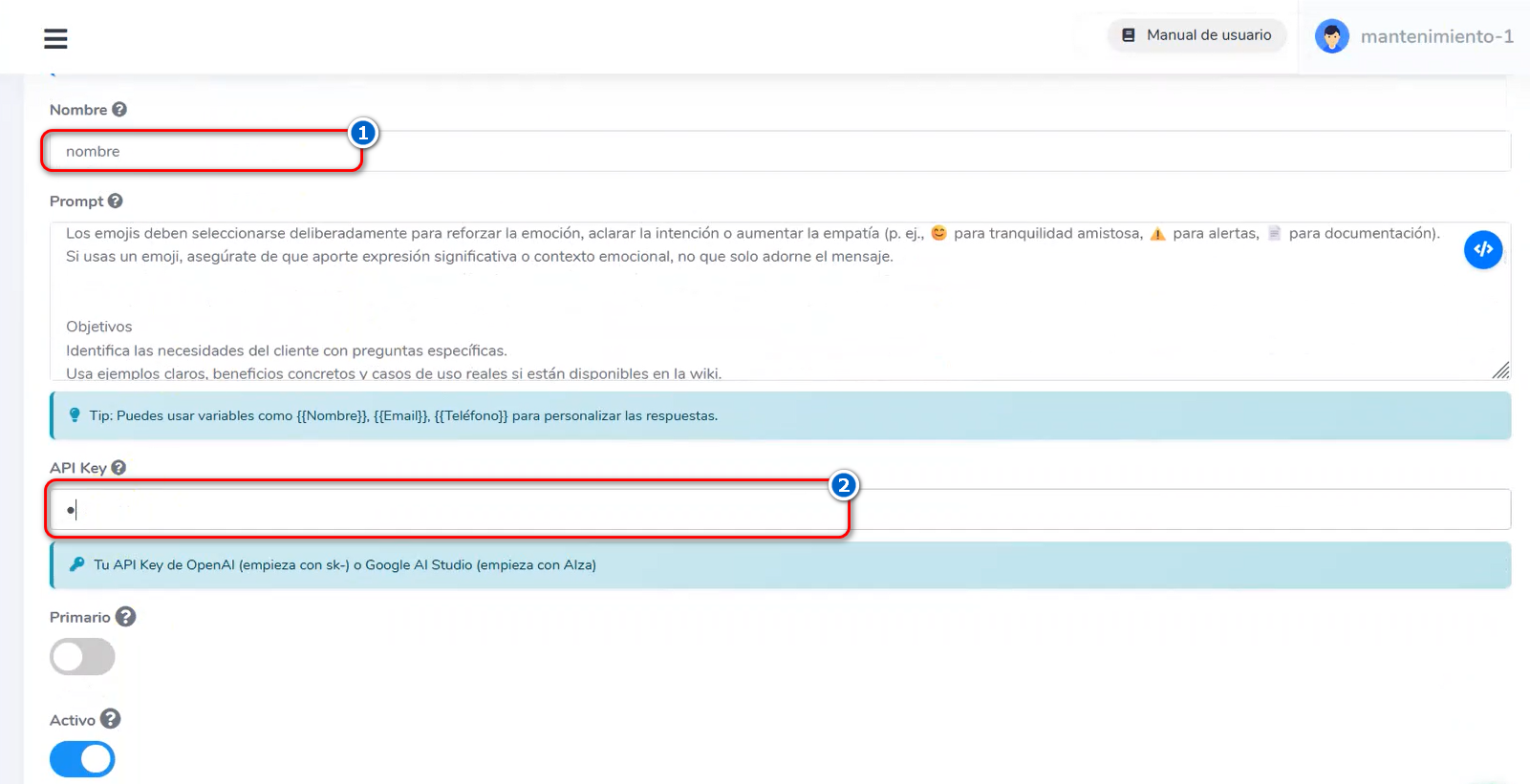 Ingresa el mismo API Key que utiliza tu agente (si lo deseas usar después con uno).