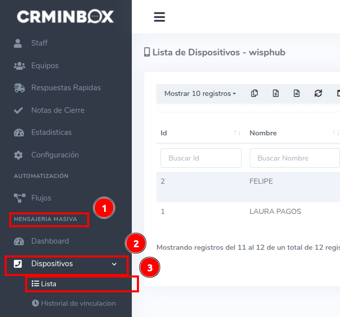 1 Dirigirse al módulo de Mensajería Masiva y seleccionar Dispositivos.