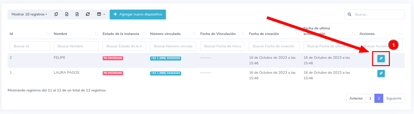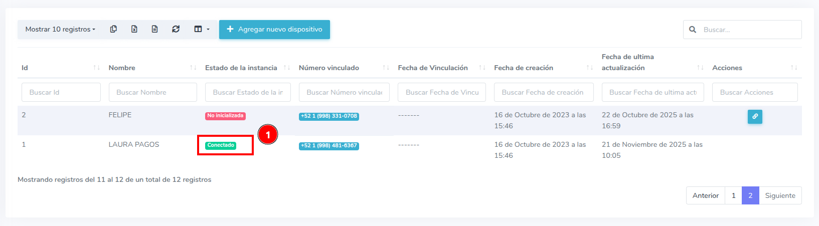 Desde el menú principal, navega a "Mensajería Masiva" → "Dispositivos" → "Lista". Aquí podrás ver todos tus dispositivos vinculados y su estado de conexión.