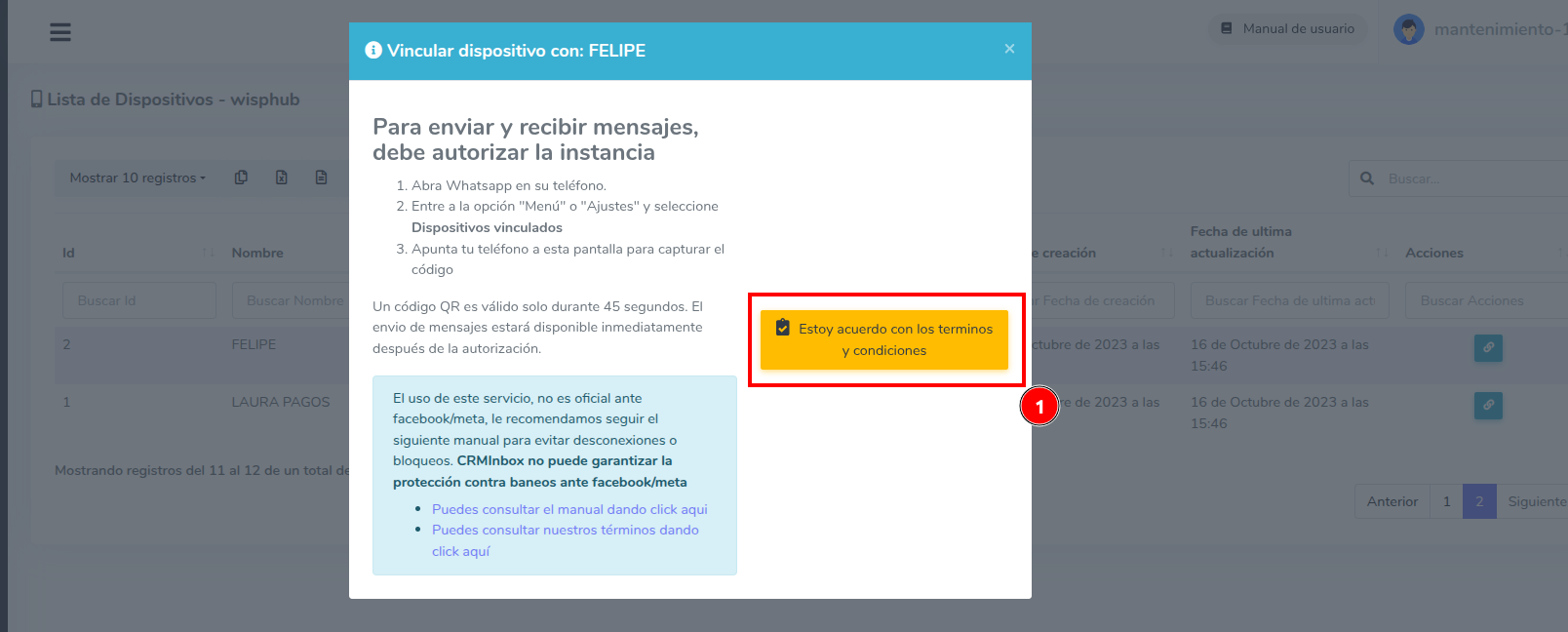 Este manual te enseñará a reconectar tu dispositivo de WhatsApp cuando se desvincule de CRMInbox en el plan de Mensajería Masiva con QR. Es importante entender que este método utiliza un medio no oficial que puede desvincularse de forma aleatoria debido a las políticas de WhatsApp y Meta.