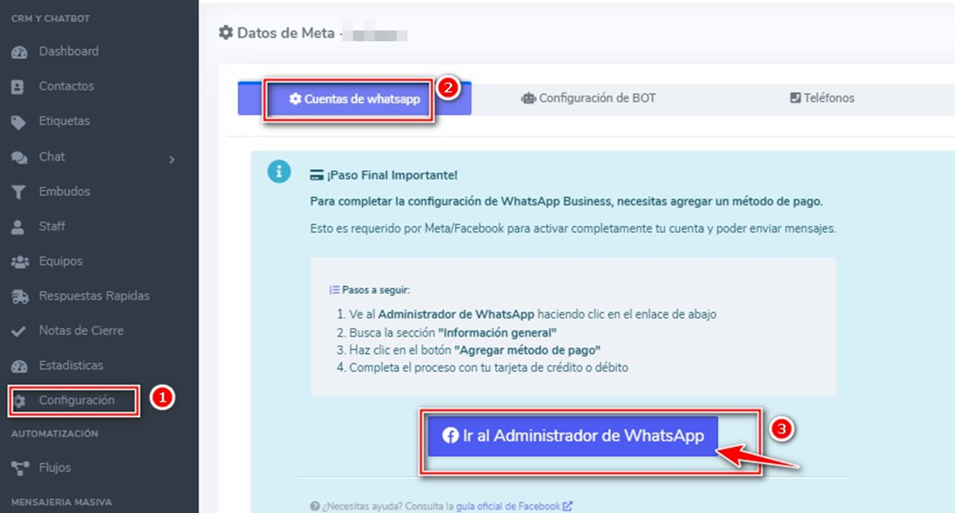 Configuración > Cuenta de WhatsApp > Ir al administrador de WhatsApp