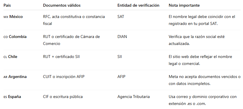 Ten en cuenta que Meta valida la información según las normas comerciales de cada país. Asegúrate de usar los documentos correctos.